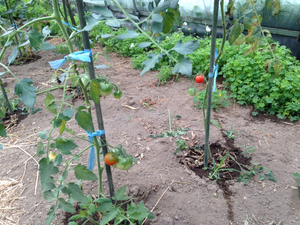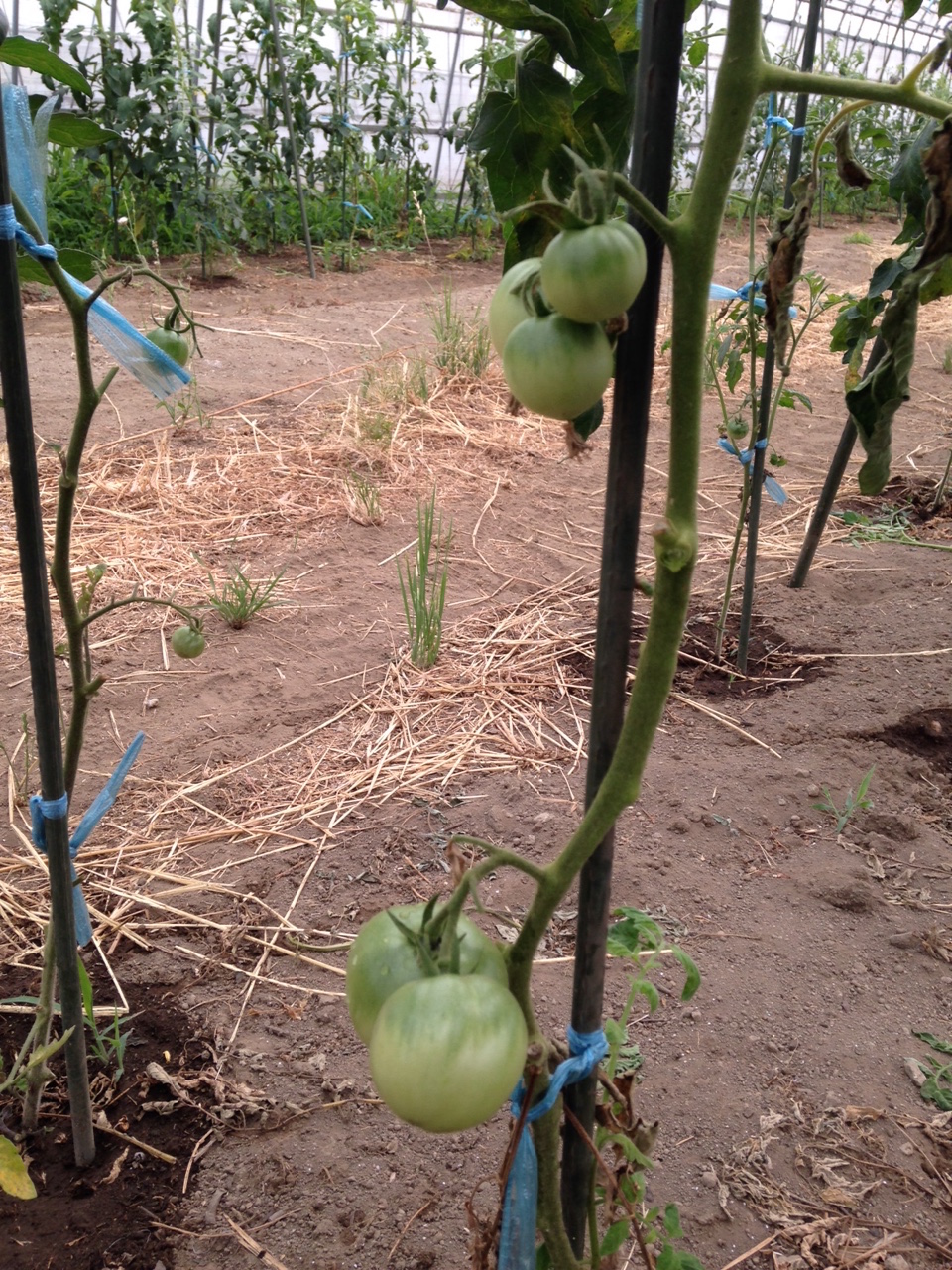 トマトは順調で、大きいものではすでに120cmくらいに成長し、実もつき始めています。