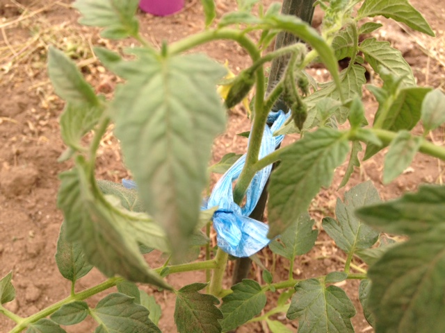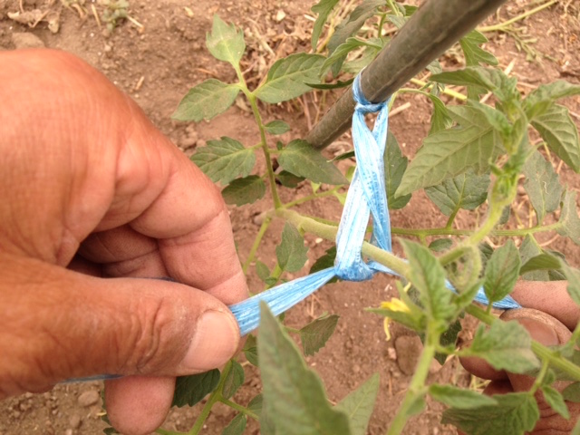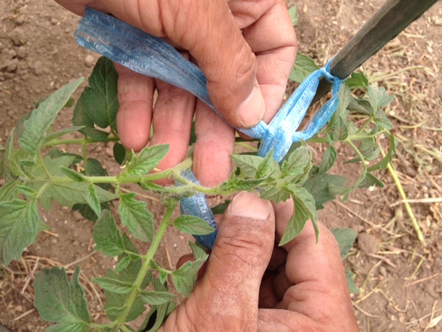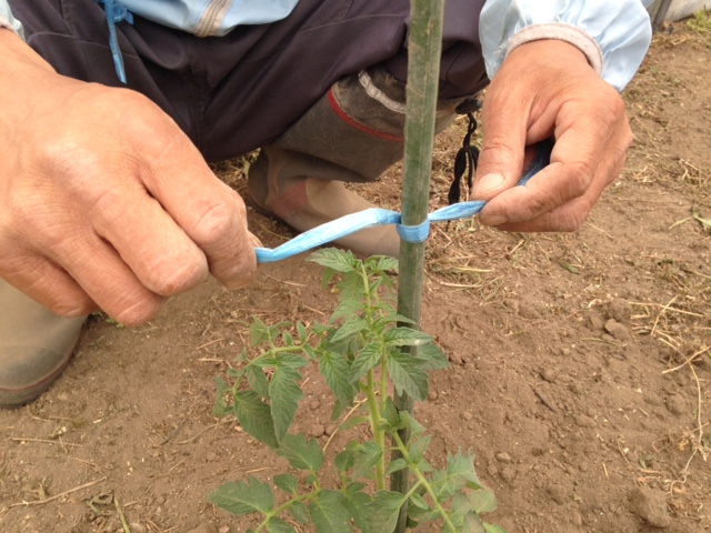 ◆まずは紐はゆるめに◆②地面から苗の背丈の7分目くらいで、紐をしっかりと支柱に固定します。