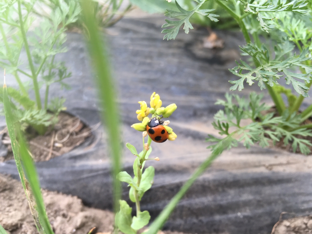 ◆人参とナナホシテントウの成虫◆今は雨も上がり、斜陽の薄日が射してたひふみ農園