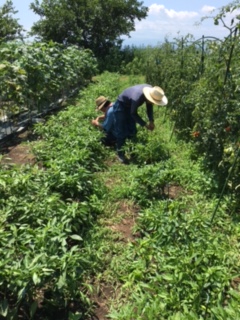 梅雨明けのような晴天の下トマトの棚修正とピーマン、しし唐の誘引準備です。