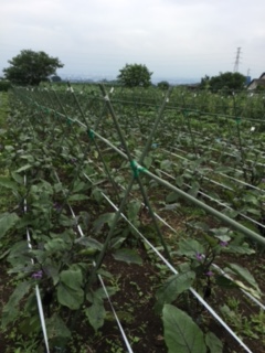 良く見ないと分かりませんが、白いテープ状のものがナスの倒壊を防ぎます。